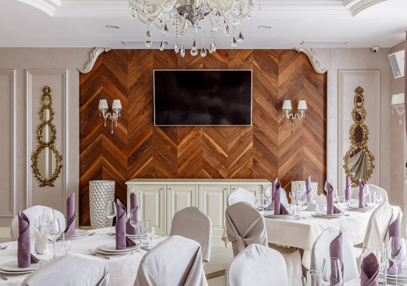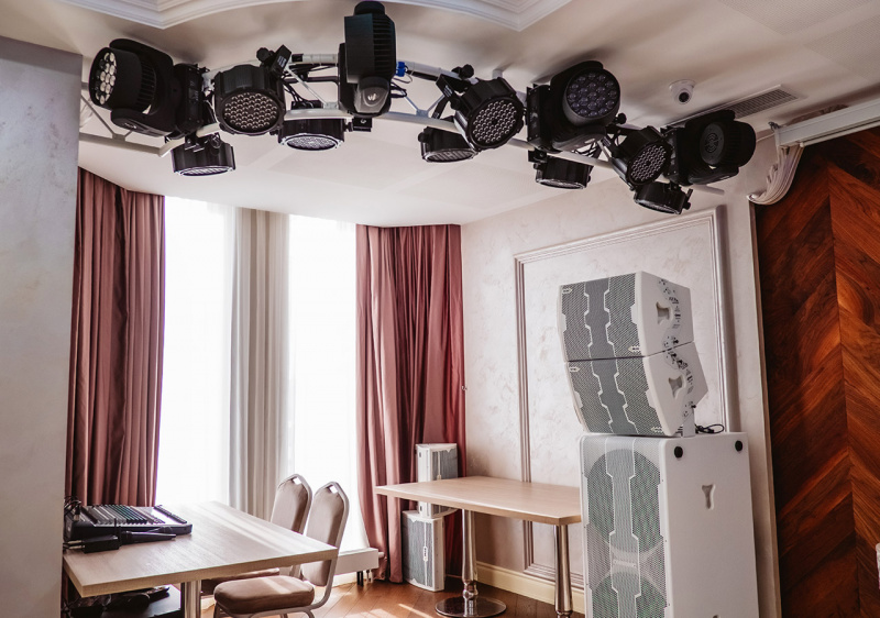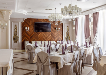 #мощная_кухня – фирменный хэштег ресторана. И это неудивительно: тут подают свиной антрекот в маринаде из тимьяна и розмарина, тёплый салат из куриной печени, приготовленной методом су-вид, и еще много вкусностей, созданных по секретным рецептам. 10 кВт качественного звука, выдвижной белоснежный экран для профессионального проекторы, сцена для ведущего или для музыкантов, потолок, меняющий цвет – это лишь несколько слов о техническом оснащении зала. Ваша свадьба пройдет на высшем уровне!