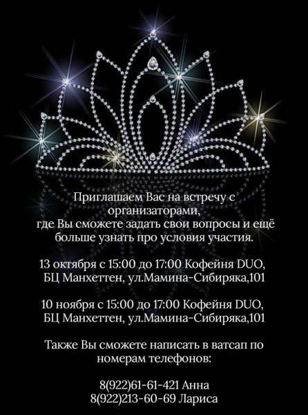 Организаторы конкурса приглашают прекрасных дам Екатеринбурга и Свердловской области в возрасте от 20 лет принять участие в VIP-премии «Главная Леди Екатеринбурга». Торжественная церемония награждения запланирована на 14 декабря 2025 года.